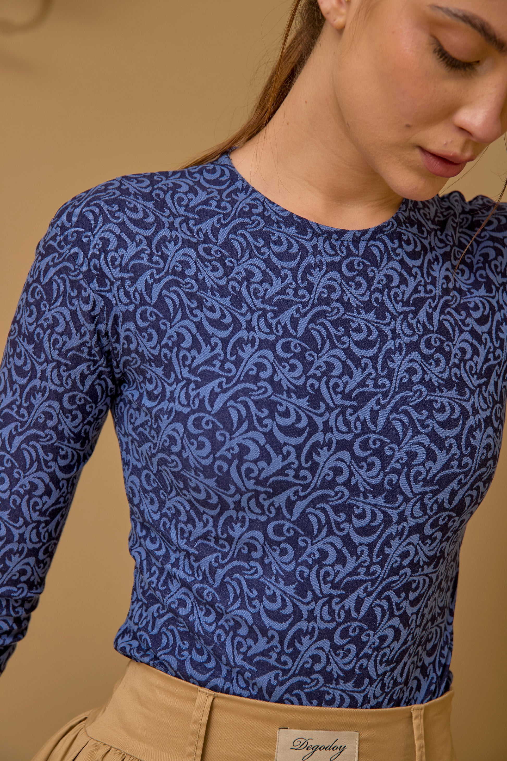 Una prenda de silueta ceñida que combina arte y sofisticación. Su tejido texturizado en un tono azul profundo envuelve la figura con elegancia, mientras el patrón intrincado aporta una dimensión visual moderna y distintiva.