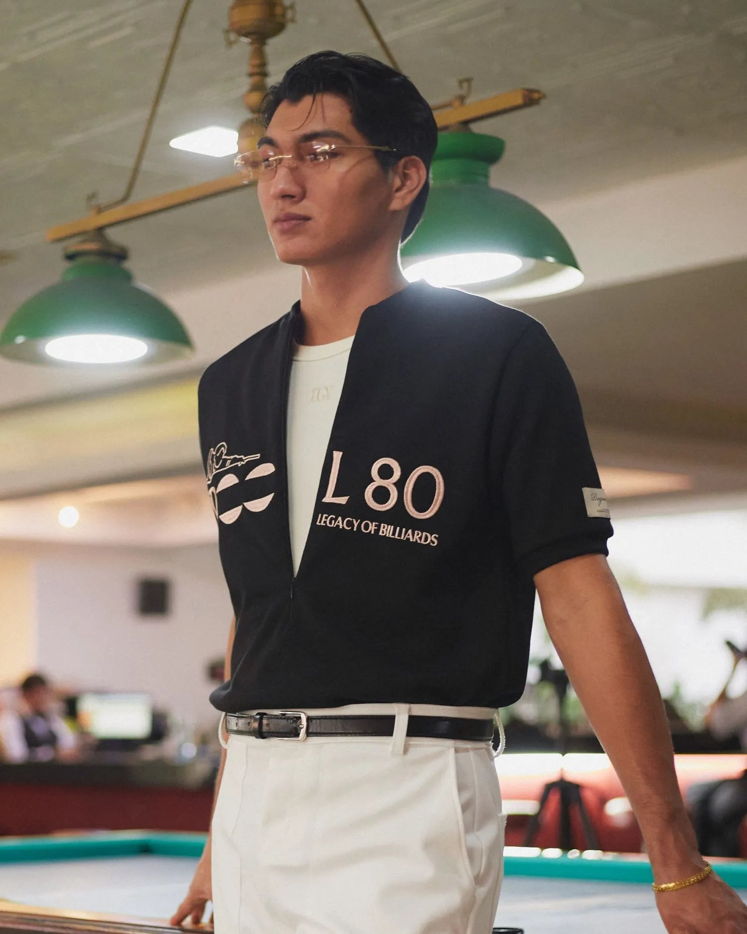 POOL80 inspirada en la estética del billar, es una camiseta auténtica, atemporal y divertida. Se destaca por su cierre hasta la mitad característico de la época, y bordada con el logo de la colección. Una prenda versátil que te hará destacar en cualquier ocasión.