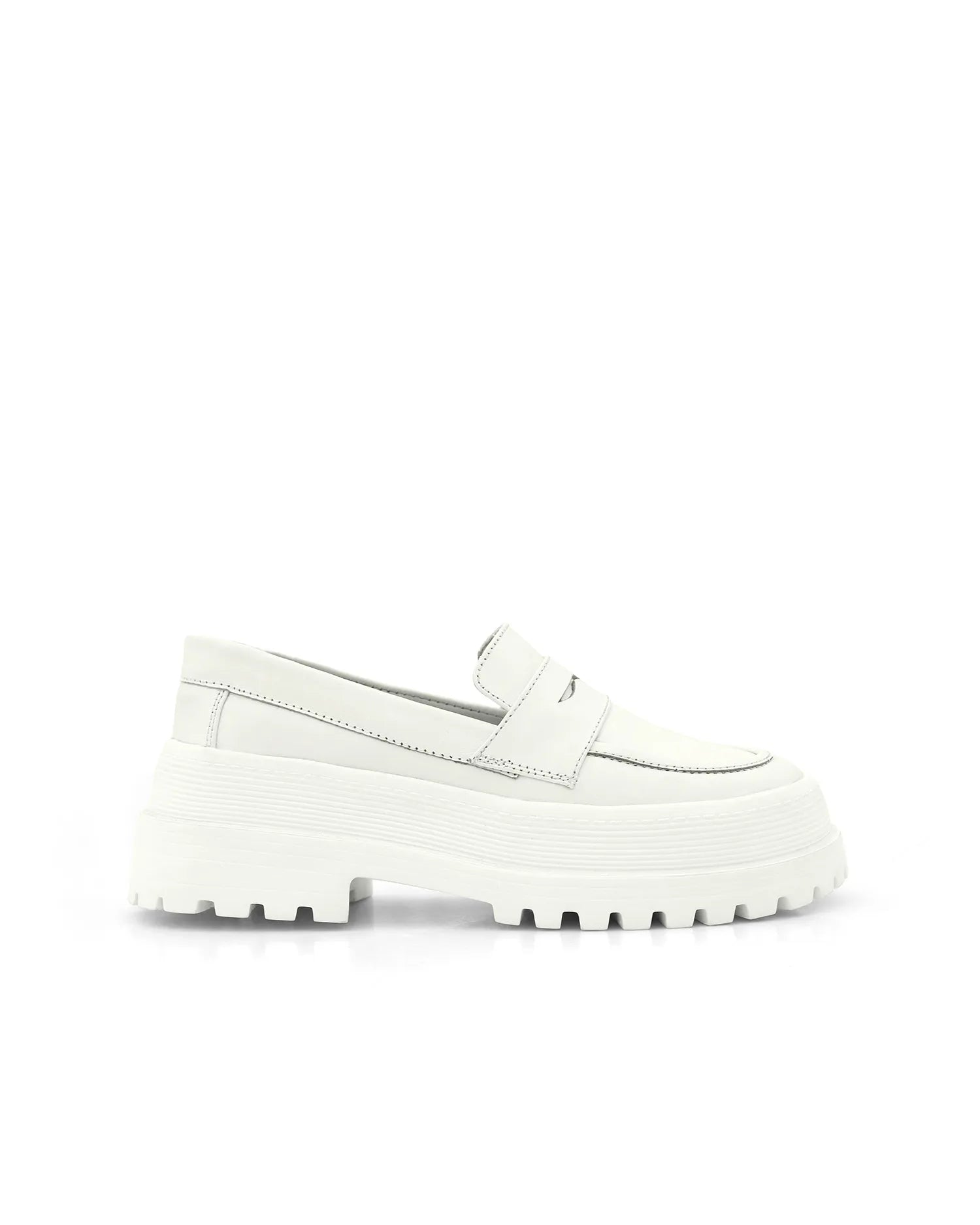 Mocasines blancos de cuero y acabado brillante, con una suela gruesa y robusta que aporta un toque moderno. Perfectos para un estilo elegante y versátil.
