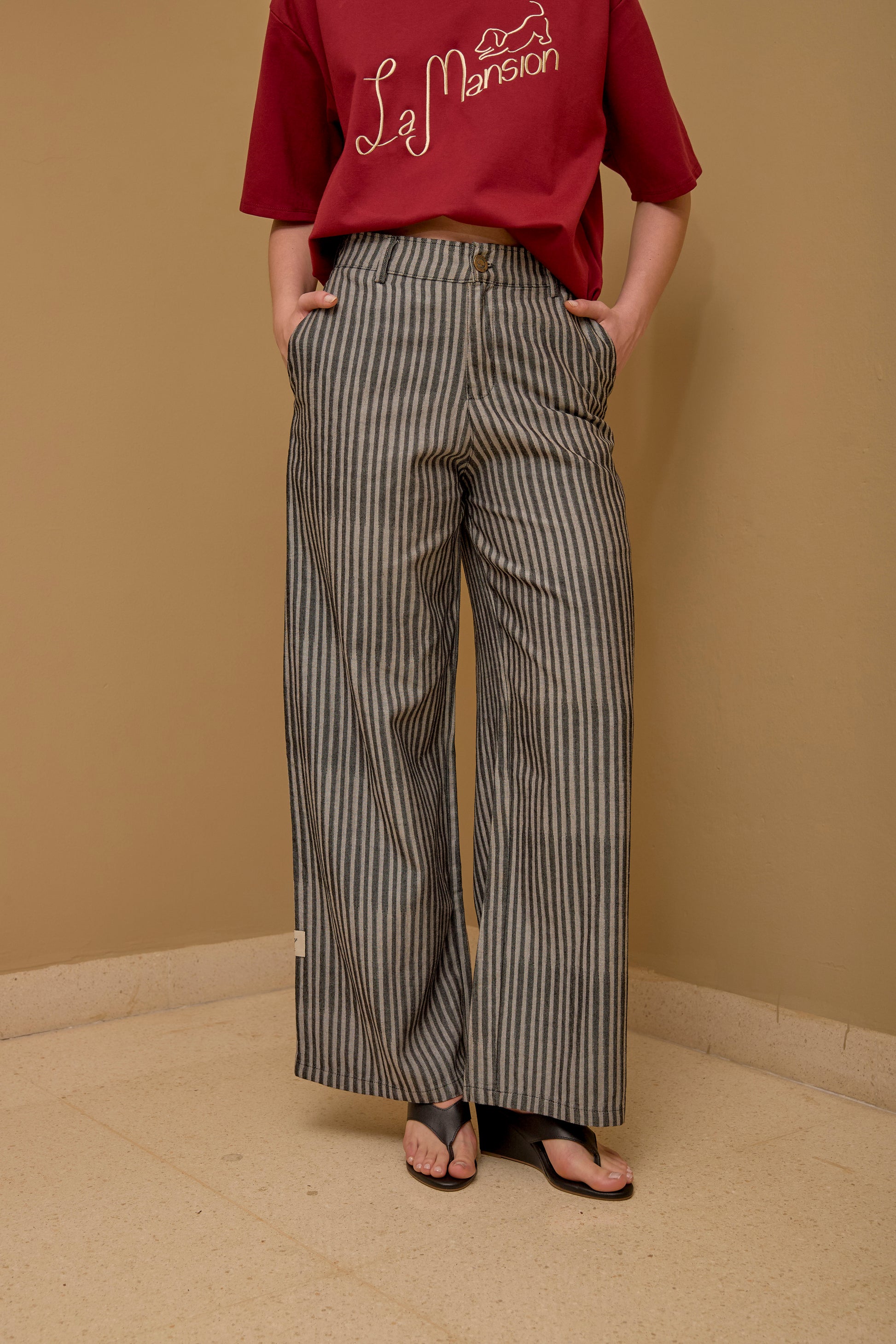 Una pieza de corte amplio que redefine la elegancia. Su tejido texturizado en tonos neutros y las sutiles rayas verticales estilizan la silueta, aportando fluidez y una presencia distinguida.