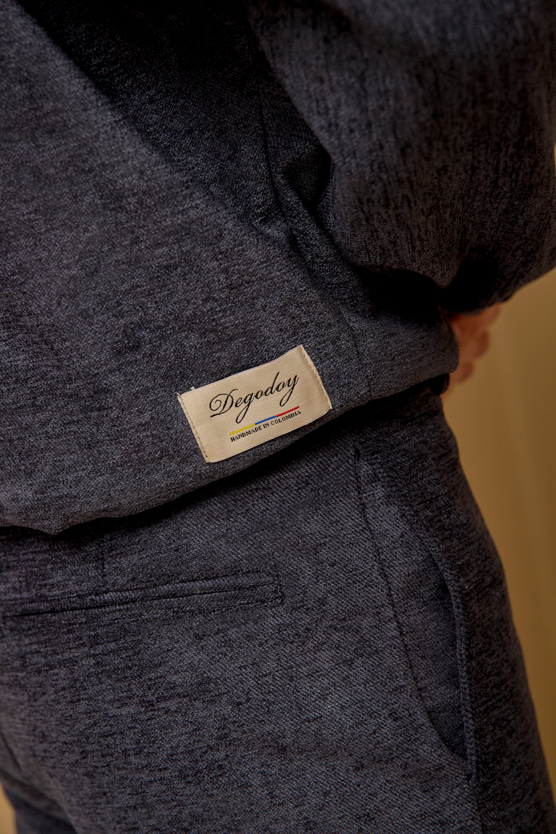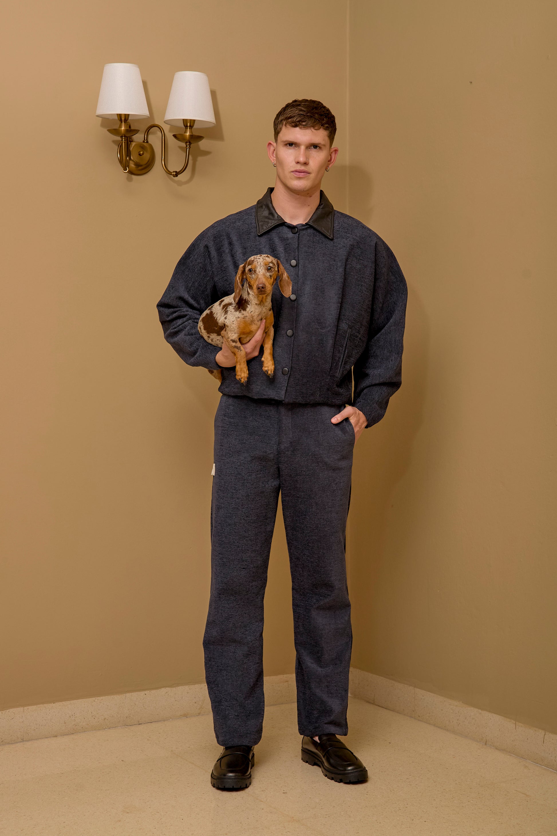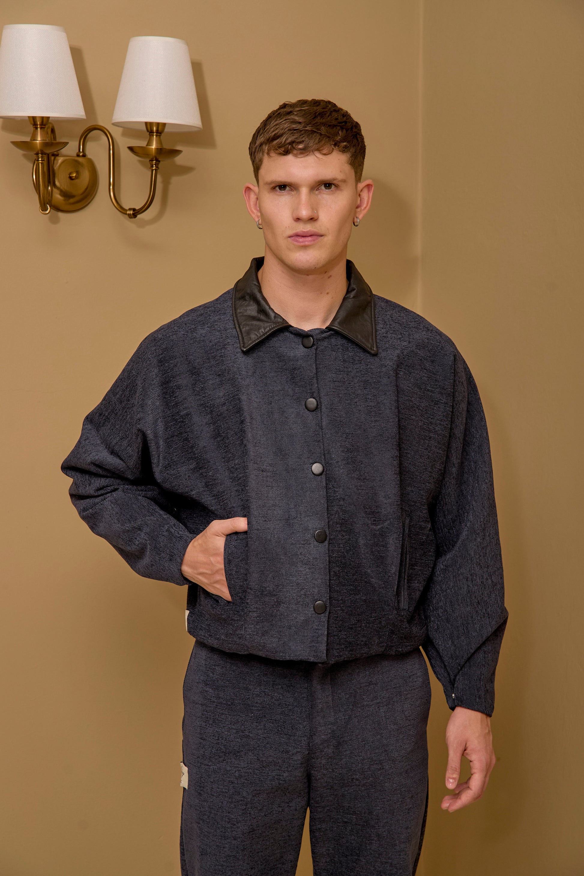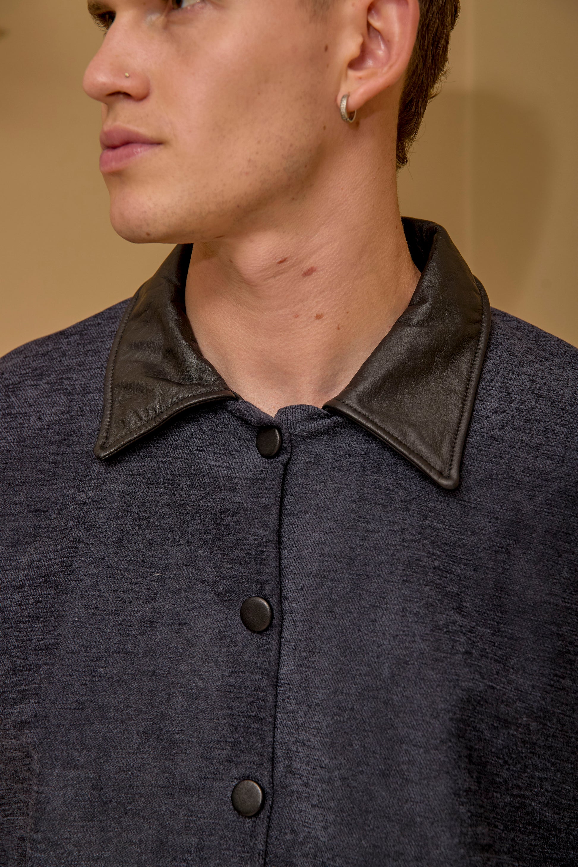 Una pieza que combina elegancia contemporánea y comodidad en equilibrio perfecto. En un tono azul oscuro con textura sutil, su corte holgado y las mangas amplias aportan una presencia relajada, mientras el cuello en cuero añade un toque distintivo y sofisticado.