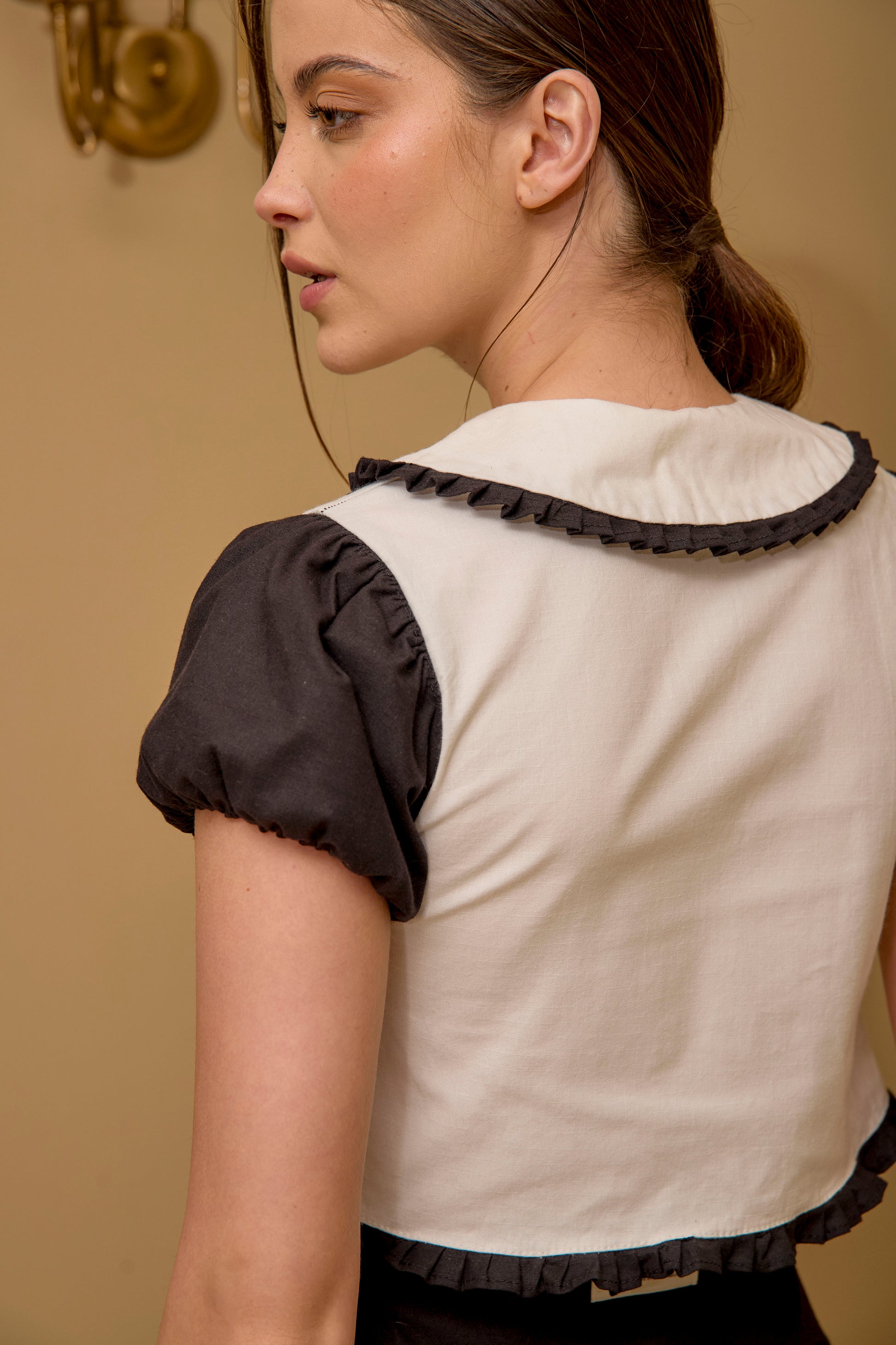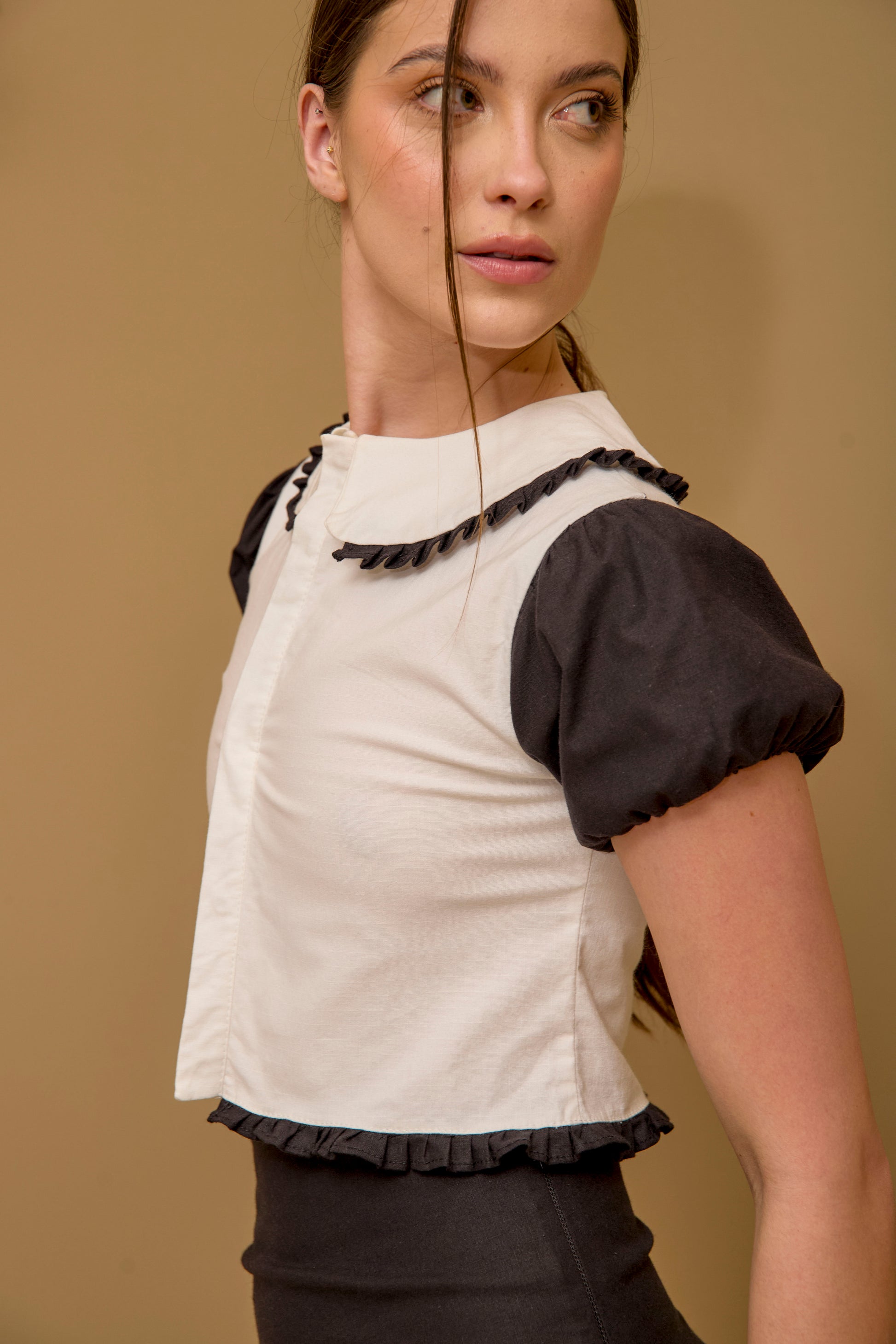 Una pieza de inspiración vintage que combina la dulzura clásica con un encanto contemporáneo. Su cuello Peter Pan con delicado ribete fruncido y sus mangas abullonadas evocan una feminidad sutil y atemporal.